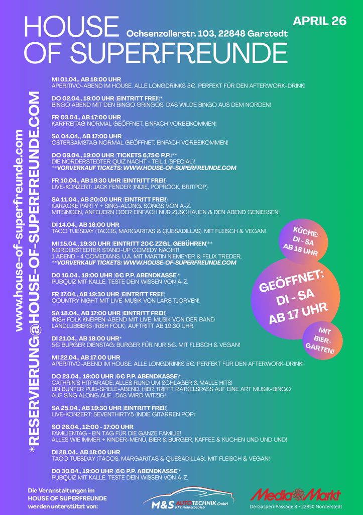 Die meisten Veranstaltungen bei uns sind nach wie vor KOSTENLOS. Für einige unserer Highlights und Events kannst du dir schon vorher Tickets in unserem neuen Shop sichern. Schau doch einmal vorbei! Vereinzelt werden Teilnehmergebühren (z.B. Pubquiz mit Kalle für 6 € p.P.) am Abend selbst berechnet. Alle Infos im Detail wie gewohnt auf unseren Monatsplakaten.