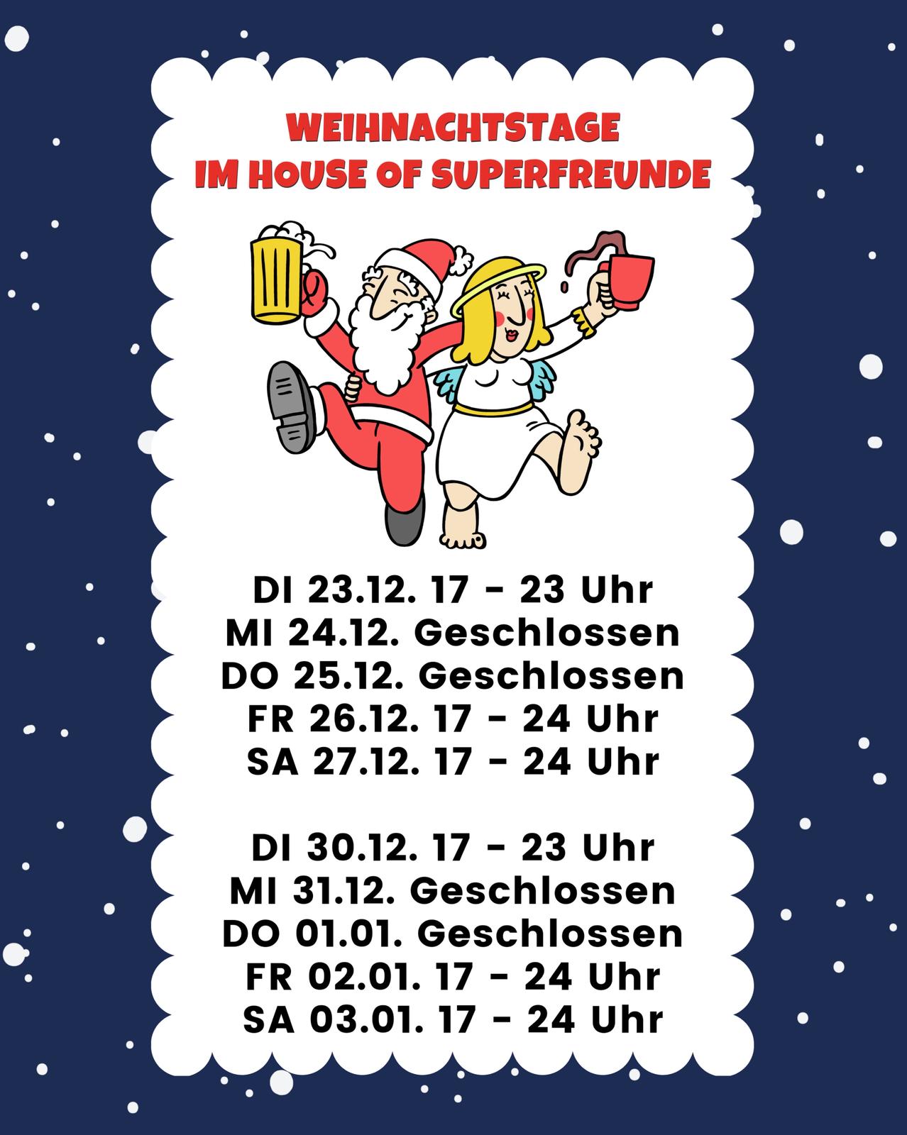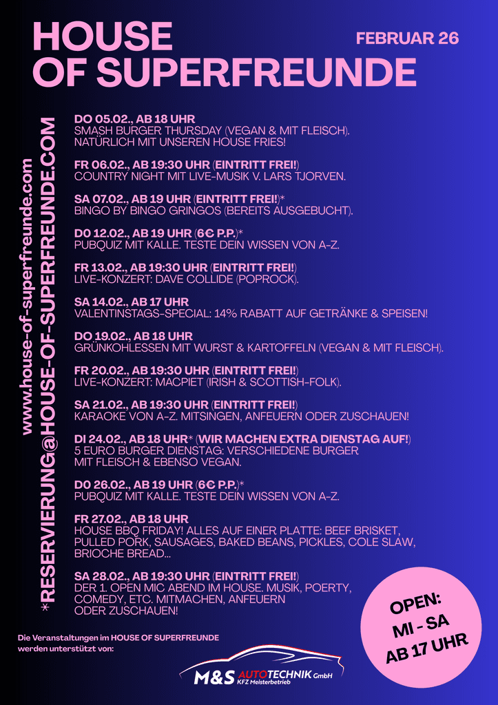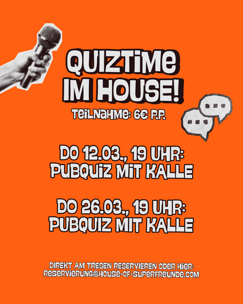 Sichere dir deinen Lieblingsplatz bei uns – ganz easy über unser Reservierungstool! Du willst uns lieber anrufen, dann hier entlang: 040 / 35731171 Natürlich kannst du auch immer so vorbeikommen! #walkinswelcome AUSNAHMEN: Für Bingo & Pubquiz bitte immer über reservierung@house-of-superfreunde.com im Voraus reservieren.